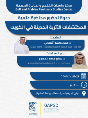 يسر مركز دراسات الخليج والجزيرة العربية دعوتكم لحضور المحاضرة العلمية " المكتشفات الأثرية الحديثة في الكويت "