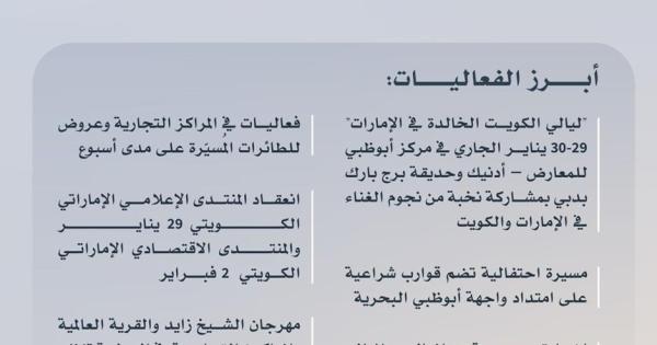 الإمارات تعلن أجندة أسبوع العلاقات مع الكويت (إخوة للأبد) متضمنا أكثر من 40 فعالية أعلنت دولة الإمارات اليوم الأحد أجندة أسبوع العلاقات الإماراتية - الكويتية الذي ينطلق الخميس..